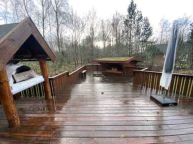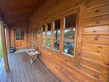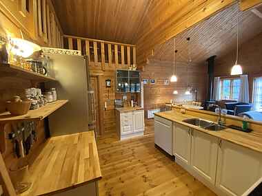 Opholdsområdet er indrettet med et lyst køkken og en hyggelig stue. Efter en lang dag kan I slappe af i husets sauna eller spabad og nyde roen.