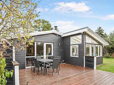 Men sommerhuset byder ikke kun på indendørs fornøjelse. Det har også en træterrasse, der omslutter huset mod både syd og vest. Her kan du nyde lange, solrige dage, sidde komfortabelt i havemøblerne og måske tage en lur i de bløde solsenge.