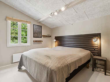 Opholdsstuen er hjemmets naturlige samlingspunkt. Her sørger pejsen og varmepumpen for komforten året rundt, mens udsigten til fjorden giver rummet karakter. Der er naturligvis også internet, så ferien kan kombineres med streaming eller hjemmearbejde.