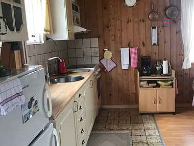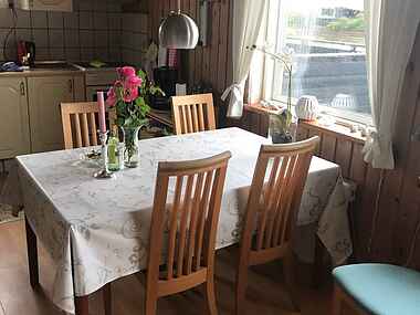 Indretningen er enkel og funktionel med internet, spiseplads og åbent køkken i forbindelse med stuen. Store vinduer giver godt lysindfald og udsigt til haven. Fra stuen er der udgang til terrassen, hvor solen kan nydes det meste af dagen.