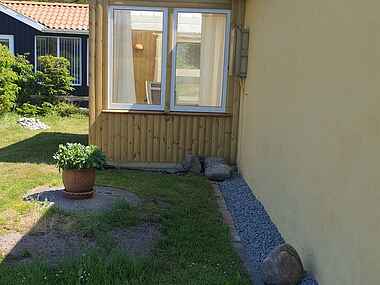 Indretningen er enkel og funktionel med internet, spiseplads og åbent køkken i forbindelse med stuen. Store vinduer giver godt lysindfald og udsigt til haven. Fra stuen er der udgang til terrassen, hvor solen kan nydes det meste af dagen.