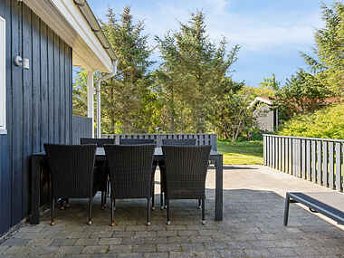 I får suveræne betingelser for at nyde livet under åben himmel på de skønne terrasser, der følger husets facader til tre sider. Her kan I nyde morgenkaffen i dagens første solstråler, servere frokosten i middagssolen og dække op til aftensmad mod vest, når dagen går på hæld. Og tiden derimellem? Den kan I passende nyde med en god bog i en liggestol – dette hus inviterer til at trække stikket og bare dase i sommerlandet. I den nederste del af haven er der lavet vild have med buske og blomster. Her kan I gå gennem haven og følge stien ud gennem hækken.