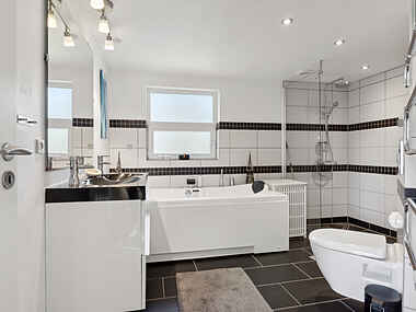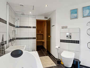 Indenfor byder huset på 96 m2 med en lys stue, tre soveværelser og et veludstyret køkken. Badeværelset er moderniseret med spabadekar og sauna – perfekte til afslapning efter en dag med oplevelser i området.