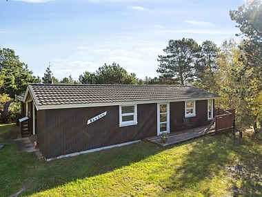 Fritidshuset ligger på en stor, naturskøn grund på 1.109 m2 med en hævet terrasse, hvor I kan nyde udsigten over den kuperede natur. Haven er let at vedligeholde, og de tilhørende udhuse gør det nemt at opbevare strandudstyr eller cykler.