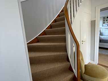 Køkkenet i lejlighed er hyggeligt og ældre, men fuldt udstyret med alt hvad man behøver for at tilberede måltider. Den lille spisekrog i køkkenet giver en intim ramme for familiens måltider og hyggelige samtaler.