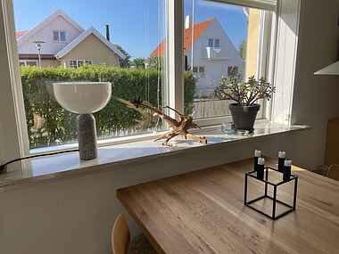 Køkkenet i lejlighed er hyggeligt og ældre, men fuldt udstyret med alt hvad man behøver for at tilberede måltider. Den lille spisekrog i køkkenet giver en intim ramme for familiens måltider og hyggelige samtaler.