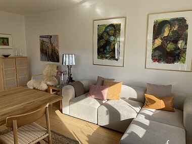 Når man træder ind i lejligheden, bliver man mødt af en dejlig lys stue, som er perfekt til afslapning efter en dag med udendørs aktiviteter. Stuen er indrettet med komfortable møbler og store vinduer, der slipper masser af naturligt lys ind, hvilket skaber en behagelig og indbydende atmosfære.