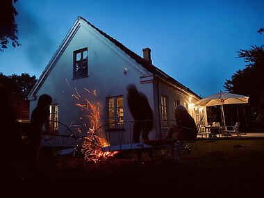 Udenfor finder du en stor have med udsigt over marker og den omkringliggende natur. Her kan du nyde din morgenkaffe på terrassen, mens du ser solen stige op over det åbne landskab. Om aftenen kan du samle familien til en grillmiddag under den klare stjernehimmel. Haven indbyder også til leg og udendørs aktiviteter for børnene, mens de voksne kan slappe af og nyde freden.