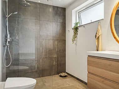 Med gulvvarme, brændeovn og en rummelig stue med hjørnesofa er der lagt op til hygge året rundt. Badeværelset har en stor bruseniche, og huset er udstyret med vaskemaskine og opvaskemaskine.