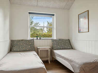 De tre soveværelser har dobbeltsenge, som kan opdeles, hvilket giver fleksible overnatningsmuligheder. Derudover er der en stor hems på 24 m2, der indbyder til hygge og leg.