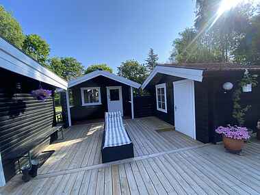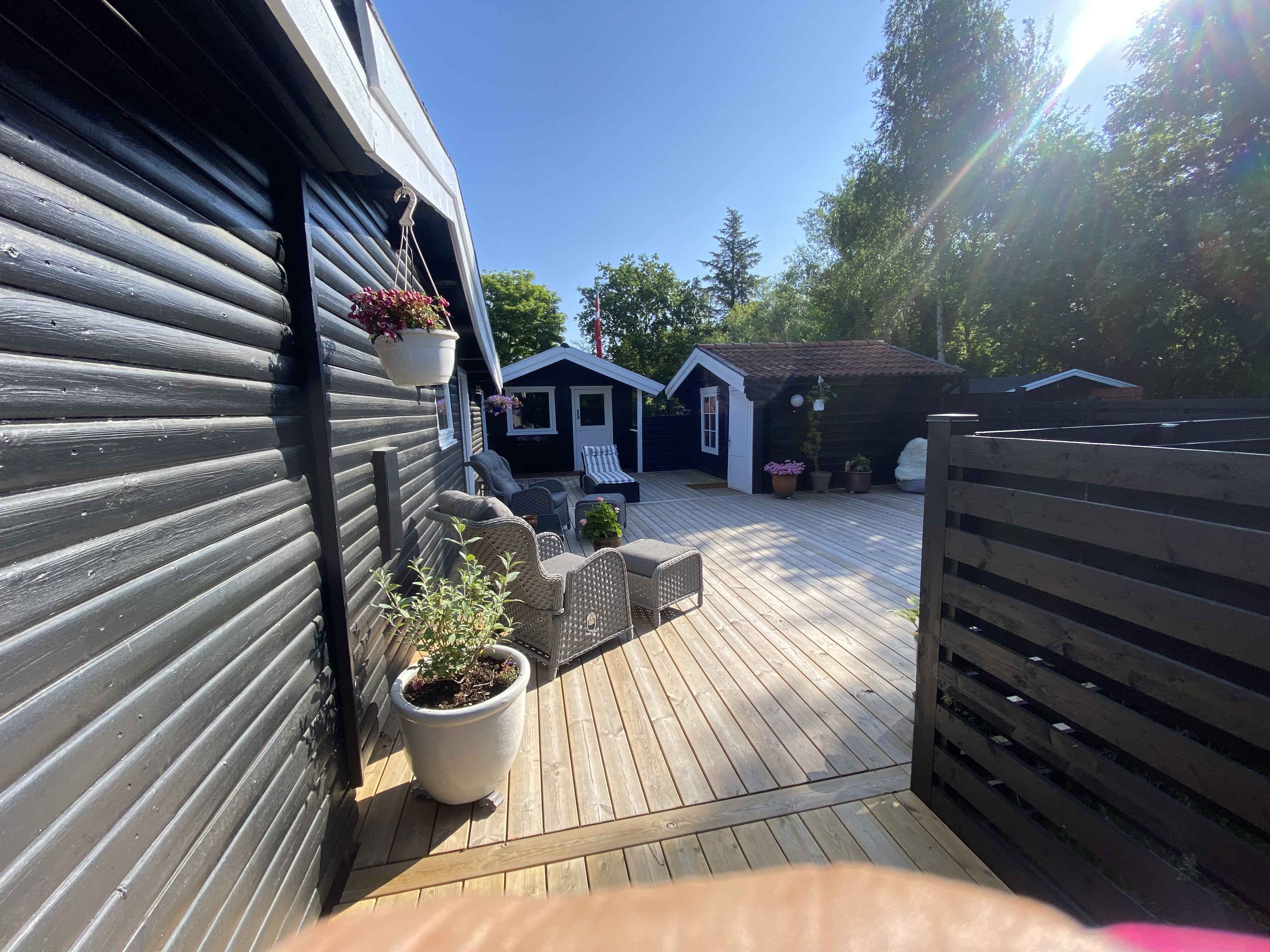 Huset er omgivet af 3 dejlige træ-terrasser – en 70 m2 ugeneret gårdhave med grill, en overdækket terrasse med lounge-stemning, samt en lille træterrasse, hvor morgenkaffen kan nydes til solopgangen inden et bad under den ugenerte udendørs bruser venter.
