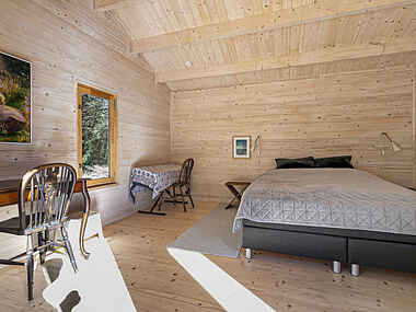 Annekset er placeret tæt på hoved-huset og det er forbundet med en stor dejlig træterrasse. Annekset har loft til kip, er isoleret og kan opvarmes. Der er en dobbeltseng (160 cm.)