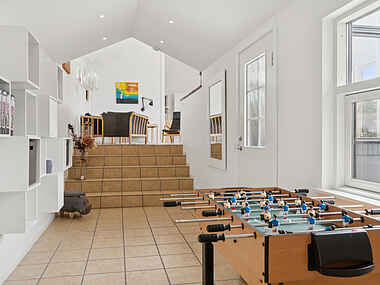 Fra den lyse stue og det åbne køkken er der direkte adgang til en solrig terrasse med udsigt til Lammefjorden. Her kan måltider nydes i ro og fred, mens børnene leger i den nemt vedligeholdte have med god randbeplantning og plads til boldspil.