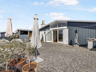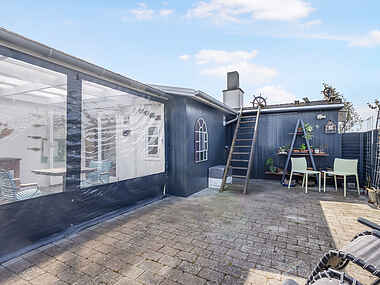 Huset er lyst og venligt, og der er hyggehjørner og liggestole, en lukket og privat terrasse og inde- og udekøkken.