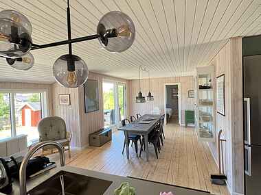 Huset rummer bl.a. 3 soveværelser, med enten twin opredning eller dobbeltseng og et flot køkken stue alrum med masser af lys.