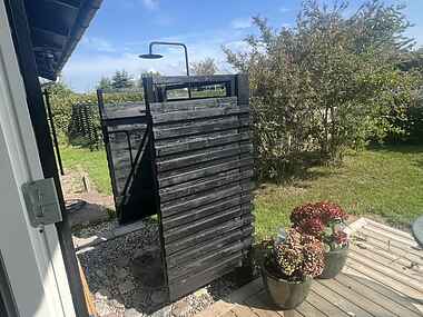 Udendørs er der adgang til en morgenmadsterrasse og en aftenterrasse, samt andre læsteder omkring huset. På morgenmadsterrassen forefindes en udendørsbruser med koldt og varmt vand.
