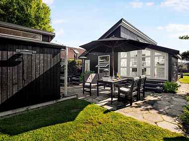 Der finde flagstang, loungeområde (4 pladser) med pejs/grill, 4 spisepladser i forhave, 4-6 spisepladser i baghave, 2 solsenge, Fat Boy hængekøje, Char-Broil gasgrill med 5 blus, Weber kuglegrill og Eva trio grill, udendørs brus med koldt og varmt vand, diverse cykler/løbehjul, svømme-/bade udstyr, legetøj, spil og kajak på ejendommen.