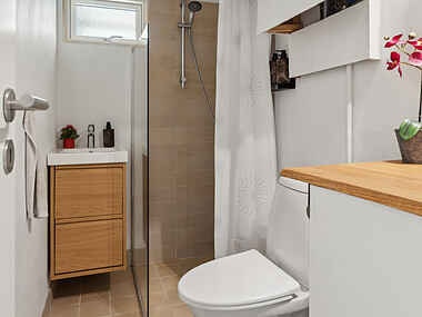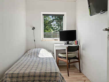 Det nye badeværelse er en oase af velvære med gulvvarme og stilrene installationer. Hvert værelse er forsynet med et TV, og der er mulighed for at tilslutte chromecast, så du kan nyde dine yndlingsserier og film (husk eget login til streamingtjenester).