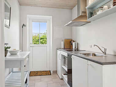 Lejligheden er udstyret med eget badeværelse og toilet samt et fuldt udstyret køkken, der gør det nemt at tilberede hjemmelavede måltider. Med en egen parkeringsplads lige ved køkkendøren er det bekvemt at losse bagage og indkøb. Der findes fælles vaskemaskine og tørretumbler i et lille hvidt træskur bag ved Restaurant Oldfruen. Ved siden af fyr- og vaskerummet er der en indhegnet plads til affaldssortering.