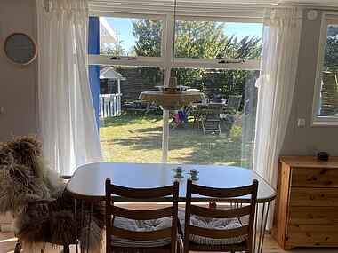 Den lille overdækkede terrasse inviterer til hyggelige stunder med udsigt over den børnevenlige have, som også har et legehus. WiFi er tilgængeligt, men forbindelsen kan være varierende.
