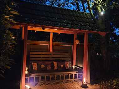 Udenfor finder I den store spændende have hvor børnene kan gå på eventyr i lysthuset i ’skoven’, og de voksne kan finde et ugeneret sted at nyde en kop kaffe. Der er også en dejlig terrasse, perfekt til grillmiddage. Der findes riste til på grill over bål, og der er også grill i udekøkkenet under overdække.