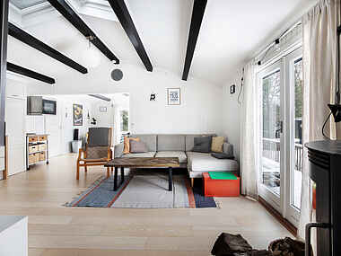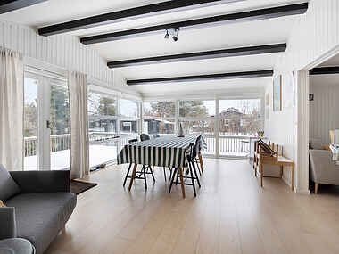 Sommerhuset strækker sig over 71 m2 og præsenterer sig med en dejligt lys og åben indretning, der indbyder til afslapning og samvær. Huset er smagfuldt indrettet med moderne faciliteter, der sikrer komfort under hele opholdet. Opholdsrummet er hjertet i huset, hvor store vinduespartier sikrer masser af naturligt lys og skaber en luftig stemning. Her er plads til både afslapning i de bløde sofaer og til måltider ved det rummelige spisebord, hvor familie og venner kan samles.