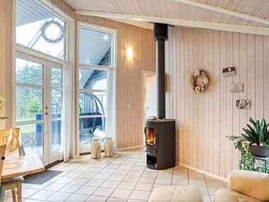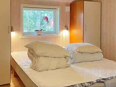 Når du ankommer til sommerhuset ser du til højre for hoveddøren et seperat bryggers med vaskemaskine. I selve huset ligger der op til entreen værelse med dobbeltseng og husets ene badeværelse. Herfra er der også indgang til åbent køkken i forbindelse med stuen og spisearrangement. Højt til loftet og med udsigt over vandet fra såvel sofagruppen som spiseafdelingen. Værelse med dobbelt elevationsseng, udsigt over vandet og udgang til terrasse, samt to yderligere dobbelt værelser. Ingen af soveværelserne ligger op ad hinanden. Værelserne ligger fordel hver for sig rundt i huset.