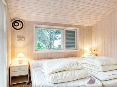 Når du ankommer til sommerhuset ser du til højre for hoveddøren et seperat bryggers med vaskemaskine. I selve huset ligger der op til entreen værelse med dobbeltseng og husets ene badeværelse. Herfra er der også indgang til åbent køkken i forbindelse med stuen og spisearrangement. Højt til loftet og med udsigt over vandet fra såvel sofagruppen som spiseafdelingen. Værelse med dobbelt elevationsseng, udsigt over vandet og udgang til terrasse, samt to yderligere dobbelt værelser. Ingen af soveværelserne ligger op ad hinanden. Værelserne ligger fordel hver for sig rundt i huset.