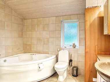 Når du ankommer til sommerhuset ser du til højre for hoveddøren et seperat bryggers med vaskemaskine. I selve huset ligger der op til entreen værelse med dobbeltseng og husets ene badeværelse. Herfra er der også indgang til åbent køkken i forbindelse med stuen og spisearrangement. Højt til loftet og med udsigt over vandet fra såvel sofagruppen som spiseafdelingen. Værelse med dobbelt elevationsseng, udsigt over vandet og udgang til terrasse, samt to yderligere dobbelt værelser. Ingen af soveværelserne ligger op ad hinanden. Værelserne ligger fordel hver for sig rundt i huset.