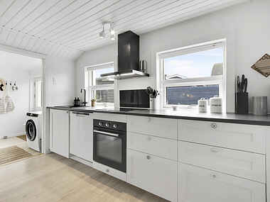 Når du træder ind i den rummelige entre finder du et værelse med 2 enkeltsenge og adgang til resten af huset. Når du bevæger dig ind i husets nye køkken opdager du hurtigt at der er fyldt godt op i skabene med service, maskiner men også salt, sukker, olie, krydderier mv. Vi tror således ikke at du kommer til at mangle noget, og vi håber at alle vil være med til at det også er lækkert når det næste ankommer.