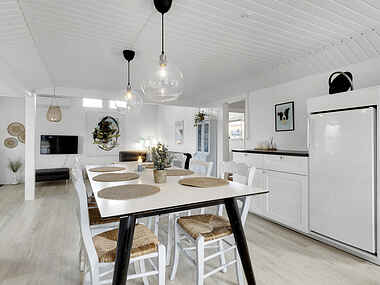 Der spiser ubesværet 6-8 personer ved det store spisebord, og herfra går man et trin ned i den rummelige stue, som imponere ved hele tre forskellige siddeområder. Der er spil, tusser, brændeovn.