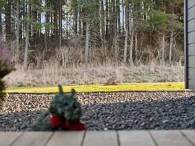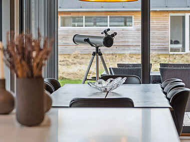 Udsigten over omkringliggende enge og skov er betagende og kan nydes både inde og ude. Naturens skønhed omfavner dig, mens du slapper af på terrassen eller oplever den fra de store panoramavinduer indendørs.
