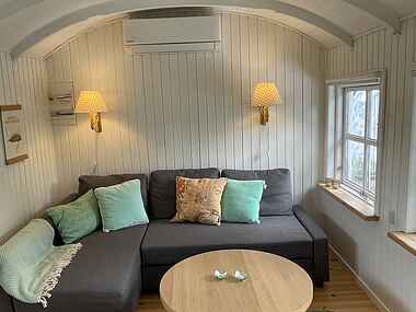 Inde i huset finder du en stor, lys udestue – perfekt til at nyde en kop kaffe mens morgensolen stiger. Boligen tilbyder fire sovepladser, herunder en halvandenmandsseng og en sovesofa, som også er en halvandenmandsmodel.