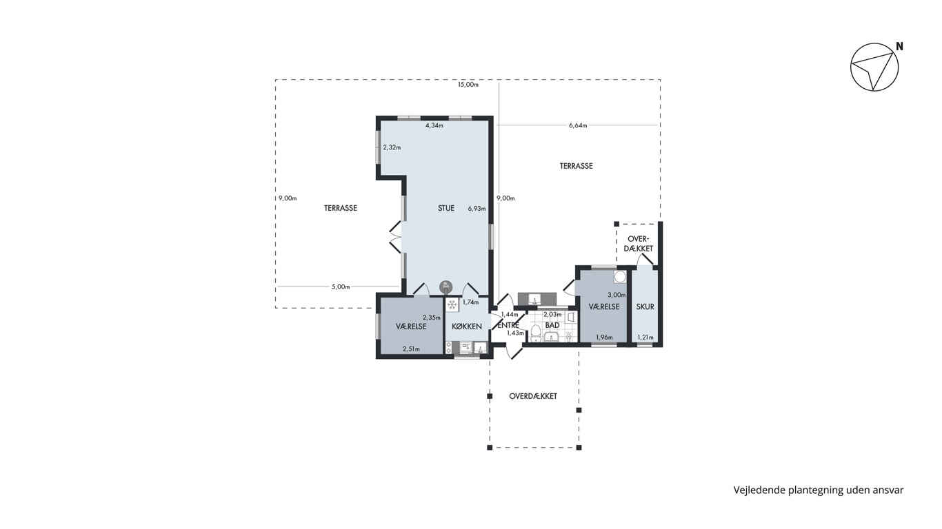 Den store grund breder sig ud om huset, og giver plads til leg og aktiviteter såvel som afslapning. Foruden den frodige, grønne beplantning med bl.a. frugttræer, der skaber privatliv, kan I glæde jer over flere skønne terrasseområder, hvoraf den store træterrasse i forbindelse med huset udmærker sig særligt – den har nemlig sol fra morgen til aften samt et praktisk udekøkken.