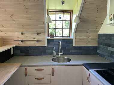 Huset har en stor lys stue, med et stort vinduesparti og to store fløjdøre, mod haves grønne træer og buske. Brændeovnens knitren kan nydes fra sofaen mens man nyder udsigten. God spiseplads til alle ved det rustikke spisebord. Stue- og spise-rummet har loft til kip, som giver en åben og rummelig atmosfære. I det lille charmerende landkøkken er de fornødne redskaber og airfyer til at tilberede maden.