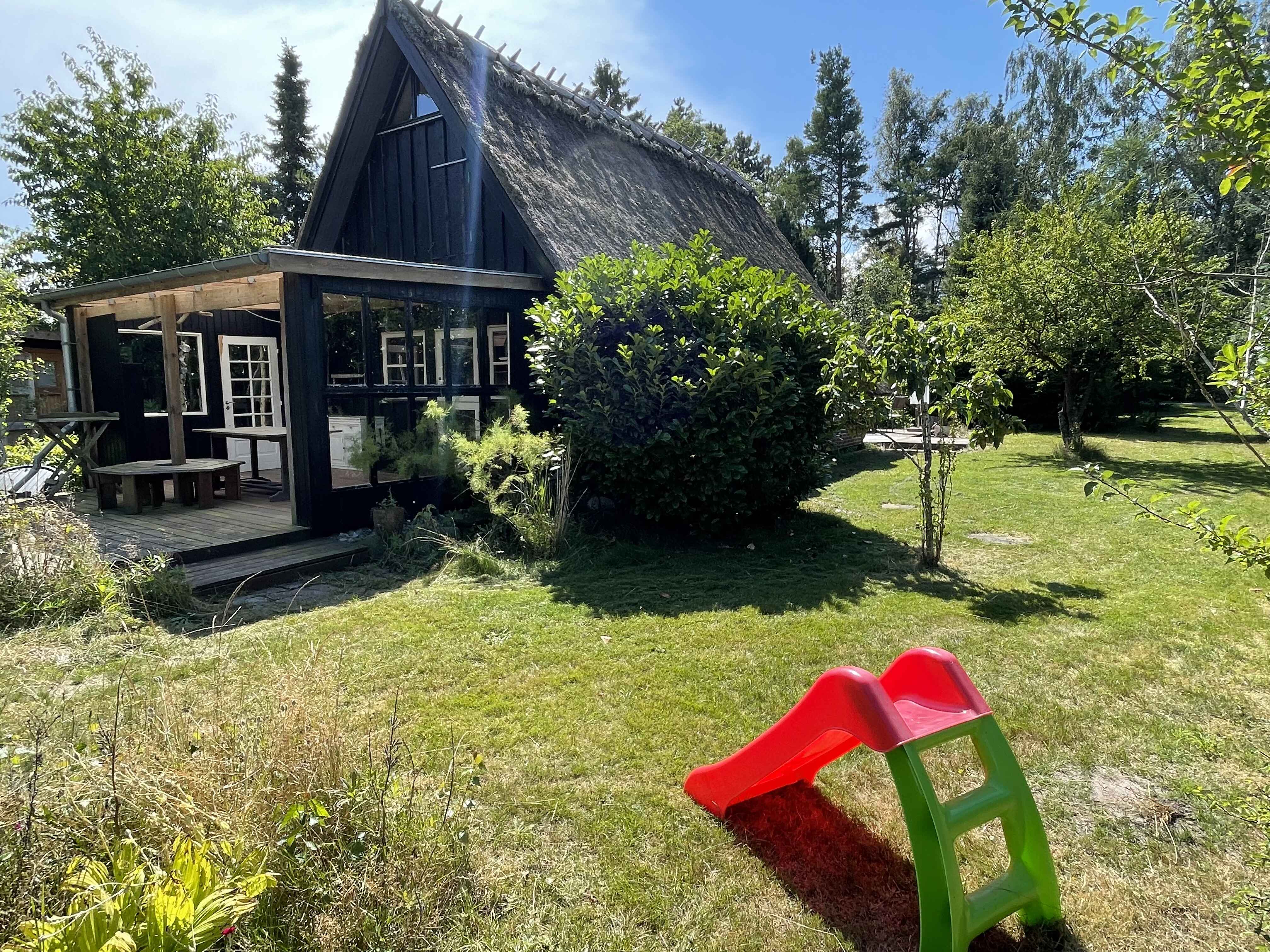 Charmerende sommerhus med stråtag muret i klassiske røde mursten, med dejligt lysindfald og en højloftet hems.