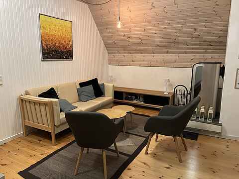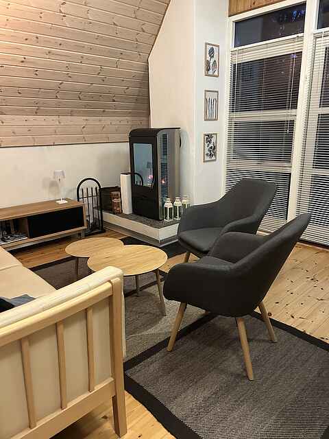 Huset har en stor lys stue, med et stort vinduesparti og to store fløjdøre, mod haves grønne træer og buske. Brændeovnens knitren kan nydes fra sofaen mens man nyder udsigten. God spiseplads til alle ved det rustikke spisebord. Stue- og spise-rummet har loft til kip, som giver en åben og rummelig atmosfære. I det lille charmerende landkøkken er de fornødne redskaber og airfryer til at tilberede maden.
