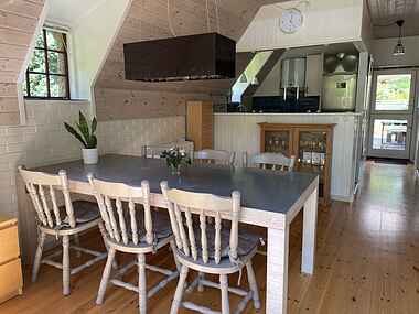 Huset har en stor lys stue, med et stort vinduesparti og to store fløjdøre, mod haves grønne træer og buske. Brændeovnens knitren kan nydes fra sofaen mens man nyder udsigten. God spiseplads til alle ved det rustikke spisebord. Stue- og spise-rummet har loft til kip, som giver en åben og rummelig atmosfære. I det lille charmerende landkøkken er de fornødne redskaber og airfyer til at tilberede maden.