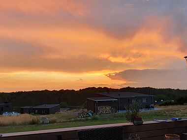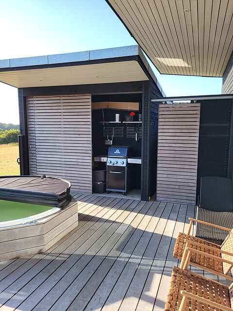 Udendørs er et fantastisk terrassemiljø med 2 overdækkede terrasser med grill og havemøbler. På den ene kan I nyde kikket til havet og morgensolen, mens I på den anden kan nyde en skøn panoramaudsigt over skov og landskab samt aftensolen.