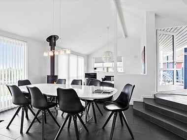 Indendørs finder I to badeværelser med gulvvarme, spa og sauna, et åbent køkken med moderne faciliteter og en hyggelig opholdsstue med brændeovn. TV med danske og tyske kanaler samt gratis Wi-Fi sikrer underholdning og komfort.