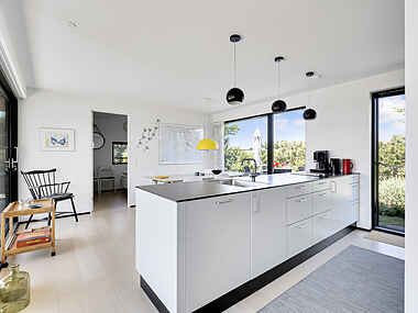 Dette sommerhus indbyder til en skøn ferieoplevelse, hvor modernitet møder komfort. Indretningen er præget af moderne møbler og senge, der skaber en afslappende atmosfære. Køkkenet er fuldt udstyret med stilfuldt køkkengrej og elegant service, og det er klogt placeret separat fra opholdsstuen – en praktisk detalje, især for familier med børn.