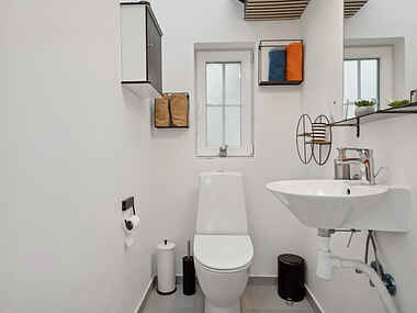 Huset er udstyret med en varmepumpe, der sikrer en behagelig temperatur året rundt. Der er også gæstetoilet, hvilket er praktisk til større grupper eller familier.