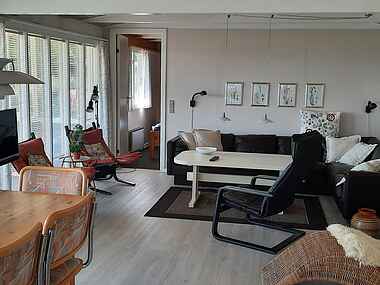 Opholdsrummet er husets naturlige samlingspunkt. Her er brændeovn, spiseplads og køkken samlet i ét, og de store vinduer vender mod vandet. Når solen går ned, er der udsigt til horisonten og åben himmel.