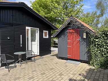 I haven er der en åben pavillon (shelter-agtig) udstyret med møbler. Forestil jer lune sommeraftener fyldt med brætspil, bløde tæpper og hjertevarmende samtaler i dette hyggelige helle.