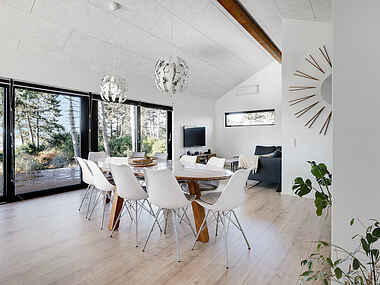 Dette charmerende sommerhus har meget at byde på, herunder et veludstyret køkken, to elegante badeværelser og en hyggelig stue. Med fire soveværelser inklusive hems, er der komfortabel plads til op til 10 gæster. To store værelser er udstyret med dobbeltsenge, et børneværelse byder på køjeseng, og det fjerde værelse har en dobbeltseng samt en hems med plads til yderligere to sovepladser.