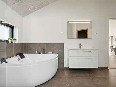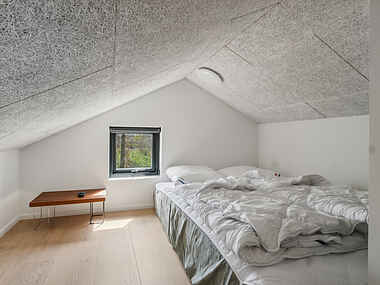 Med sine 134 m2 er der rigelig plads til alle, uanset om I ønsker at samles til hyggelige måltider i det åbne køkken-alrum eller slappe af i den behagelige stue med panoramaudsigt over den omkringliggende natur. De to komfortable elevationssenge sikrer en god nattesøvn, og de store vinduer lader det naturlige lys strømme ind og giver jer en forfriskende følelse af nærhed til naturen.