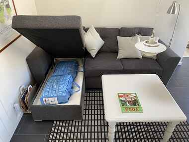 Indenfor byder huset på alt, hvad man behøver for en enkel og bekvem ferie. Opholdsrum og køkken ligger i åben forbindelse, og der er udgang til terrasse og have fra stuen. Her er både plads til fælles måltider og stille stunder.