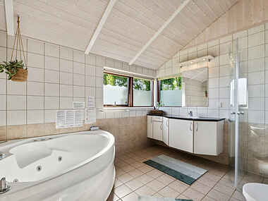 Inde i sommerhuset finder I en dejlig indendørs spa, hvor I kan slappe af og lade op efter en dag fyldt med aktiviteter. De store vinduespartier lader dagslyset strømme ind og skaber en lys og luftig atmosfære i hele huset. Fra stuen har I en fantastisk udsigt til den omkringliggende natur, hvilket giver en følelse af at være tæt på naturen, selv når I er indendørs.