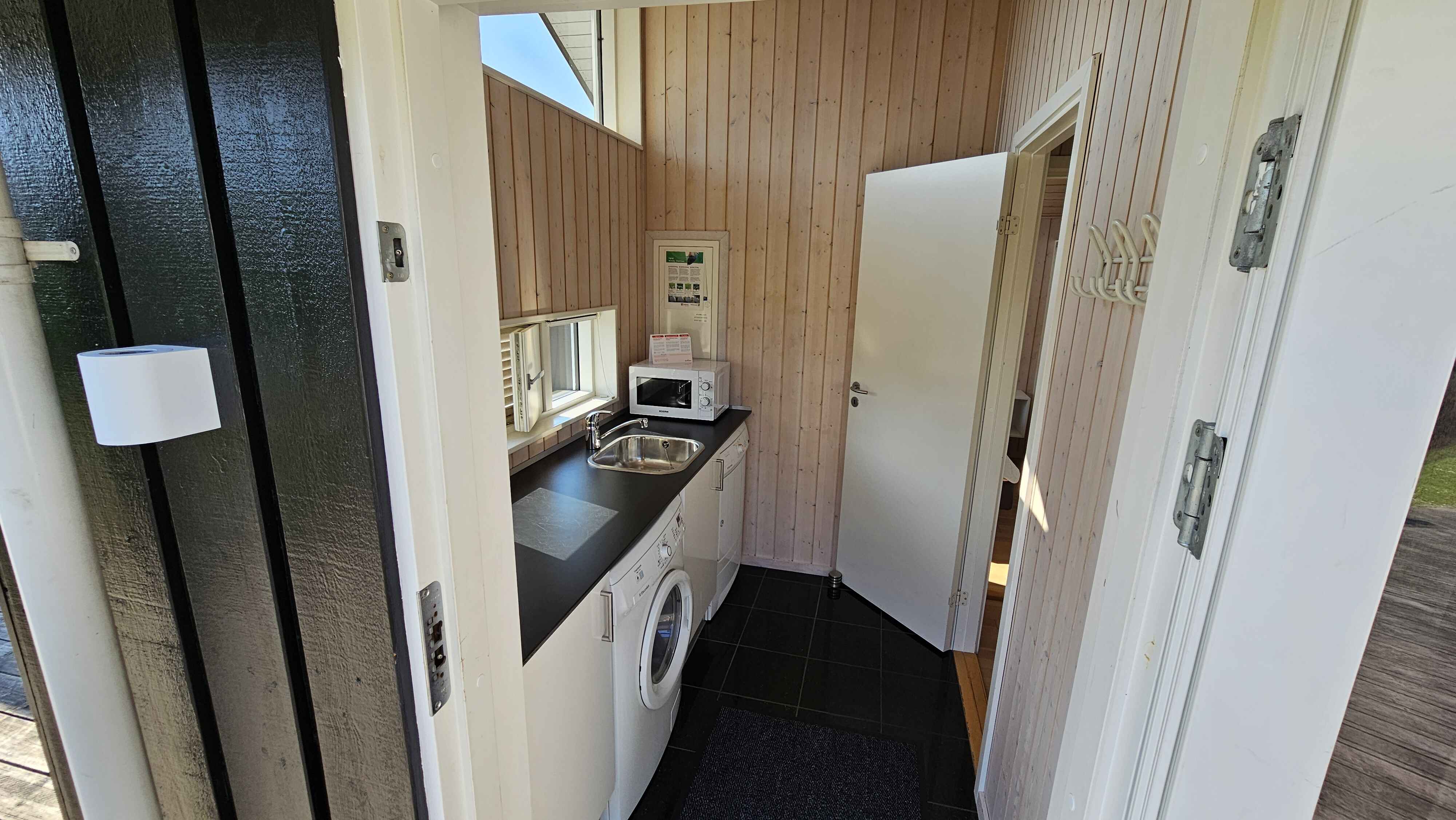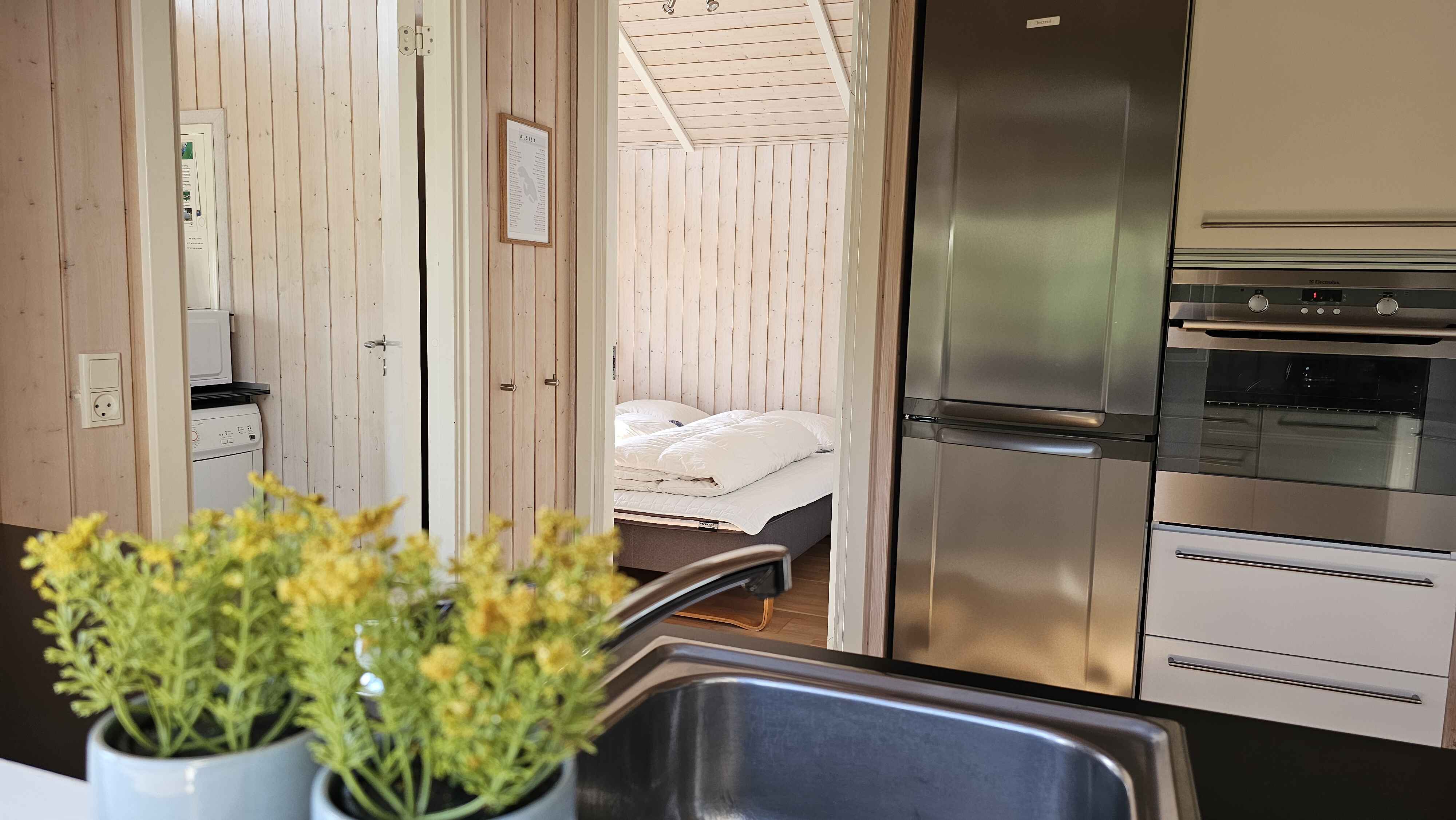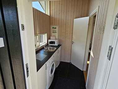 Der er en pæn entre med vaskemaskine og tørretumbler, stort, lyst og åbent køkken/alrum med lofter til kip og direkte udgang til den store, delvist overdækkede terrasse.