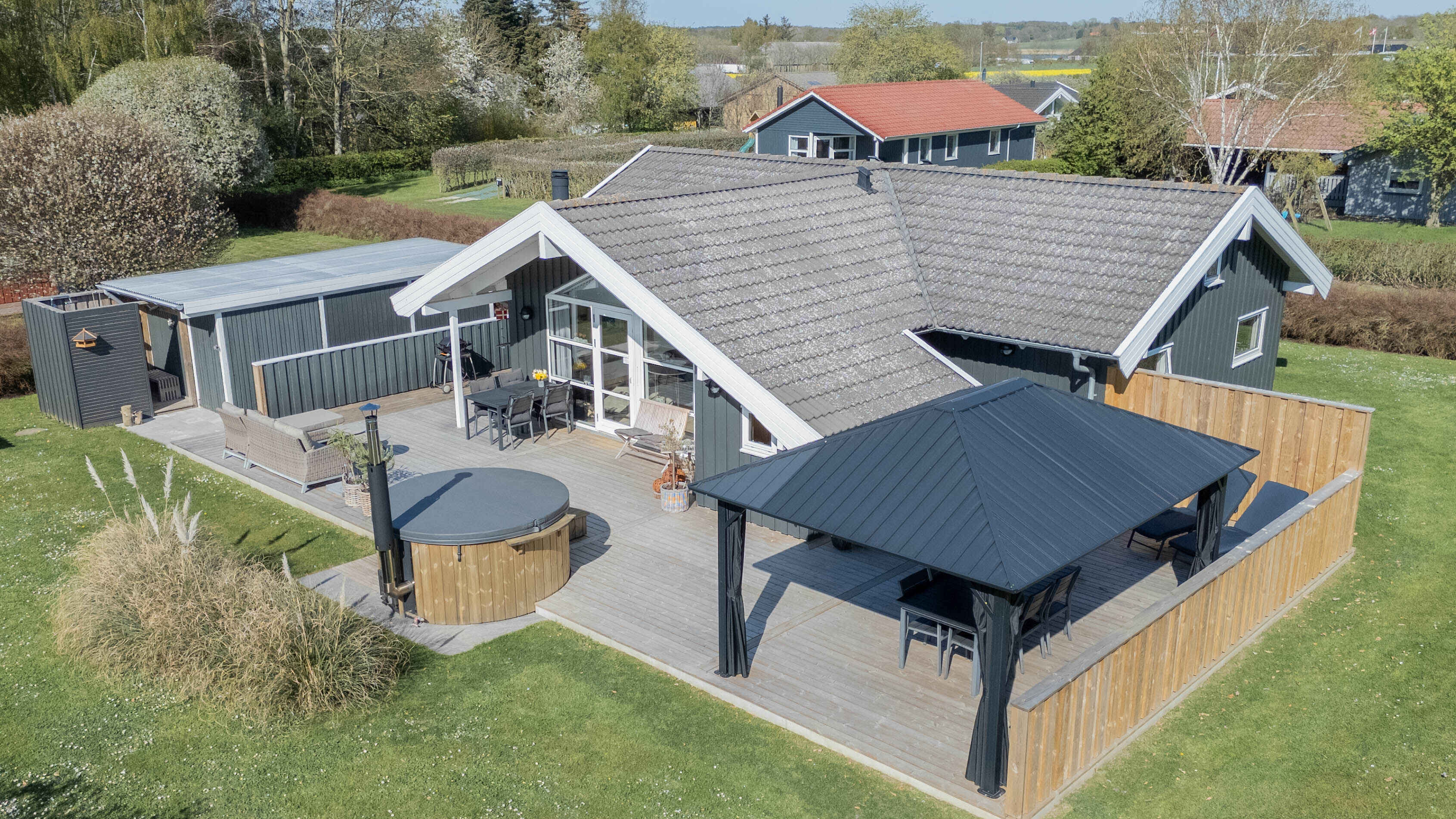 Terrassen inviterer til grill og hygge, under pavillonen med varme og LED lys.